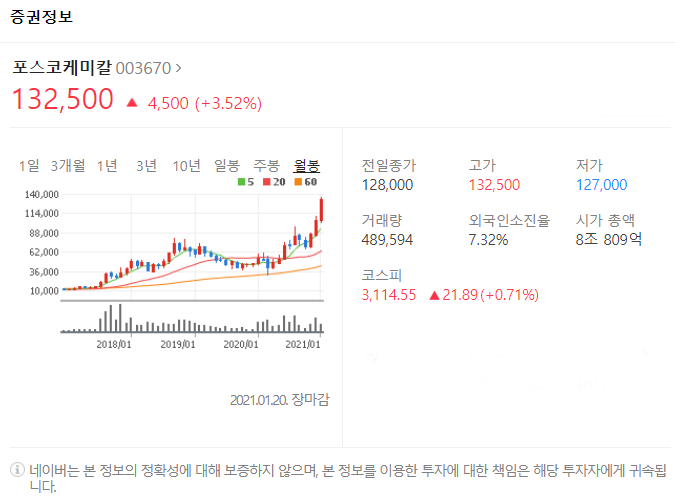 전일대비 4500원 상승했으며, 1월 20일 132500원으로 마무리 되었네요.