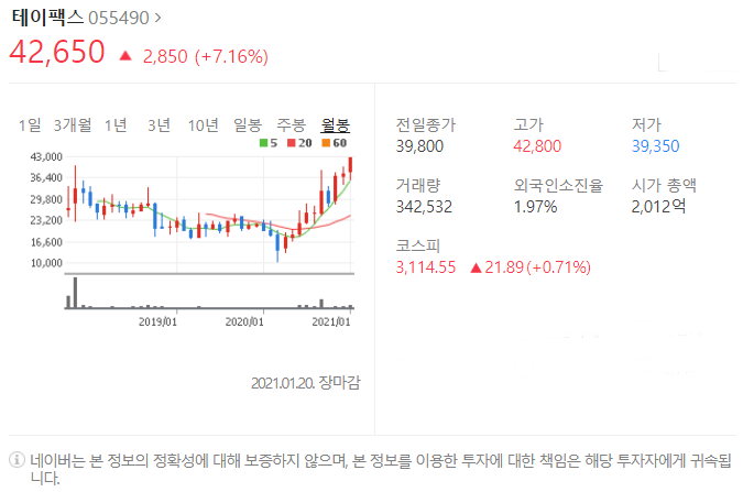 전일대비 2850원 상승했으며, 1월 20일 42650원으로 마무리 되었네요.