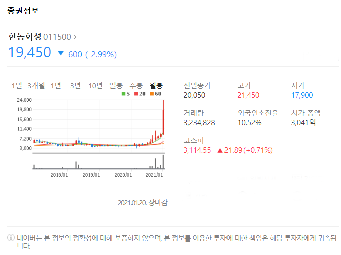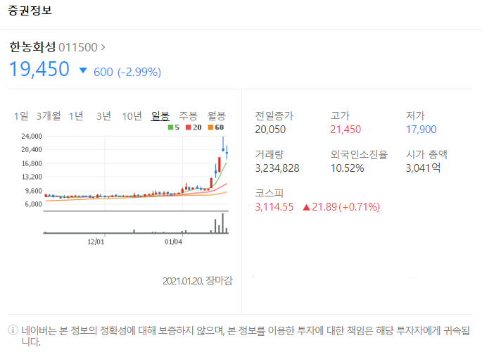전일대비 600원 하락했으며, 1월 20일 19450원으로 마무리 되었네요.