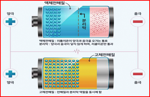 우선 전고체 배터리란, 리튬이온 전지와 확실히 다른데요. 리튬이온 전지는 전해질이 액체이고 분리막이 있어야 하는데 전고체배터리는 전해질이 고체이고 분리막이 필요가 없어서 전고체 전지라고도 불린답니다.