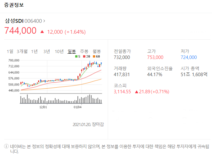 전일대비 12000원 상승했으며, 1월 20일 744000원으로 마무리 되었네요.