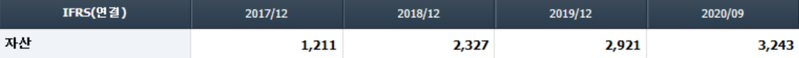 코미코의 자본 총계를 보면 2020년 3분기 1545억원으로 3년간 많이 증가한 것을 볼 수 있습니다. 부채는 2020년 3분기 1698억원이에요.