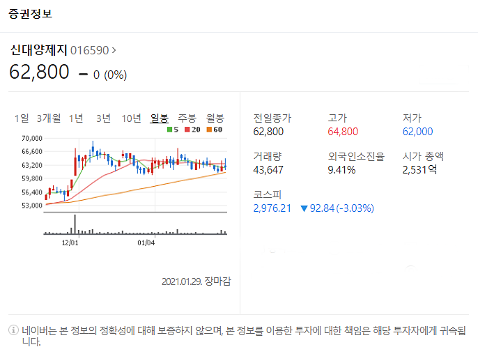 전일대비 변동 없으며, 1월 29일 62800원으로 마무리 되었네요.