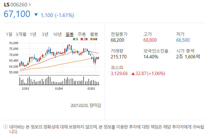 전일대비 1100원 하락했으며, 2월 3일 67100원으로 마무리 되었네요.