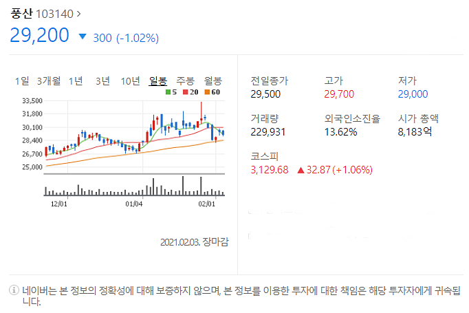 전일대비 300원 하락했으며, 2월 3일 29200원으로 마무리 되었네요.