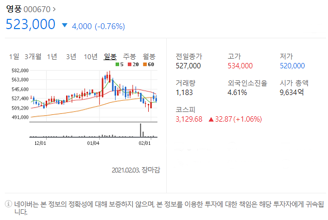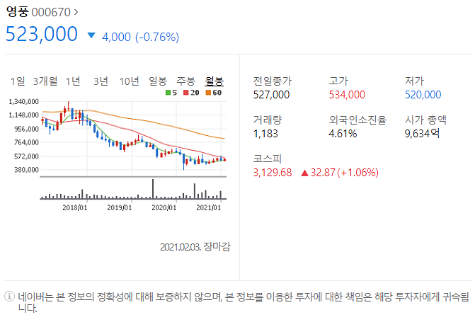 전일대비 4000원 하락했으며, 2월 3일 523000원으로 마무리 되었네요.