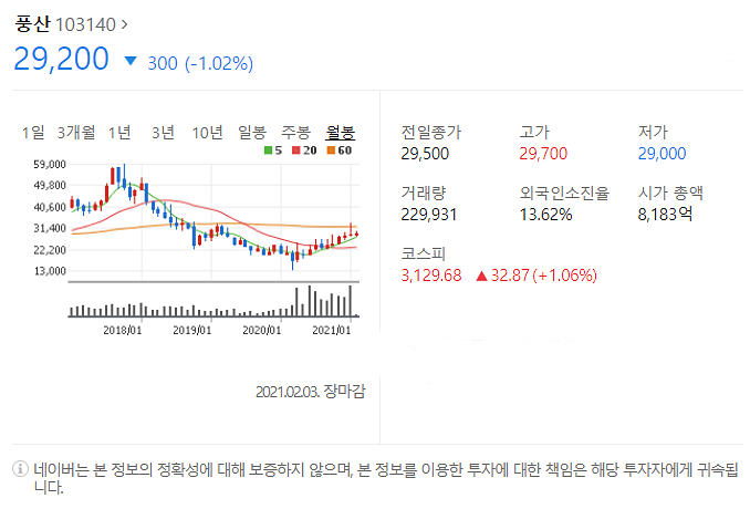전일대비 300원 하락했으며, 2월 3일 29200원으로 마무리 되었네요.