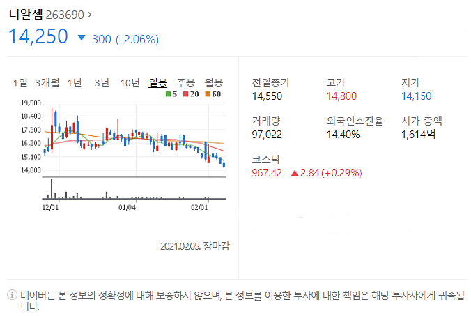 2월 5일 300원 하락했으며, 2월5일 14250원으로 마무리 되었네요.