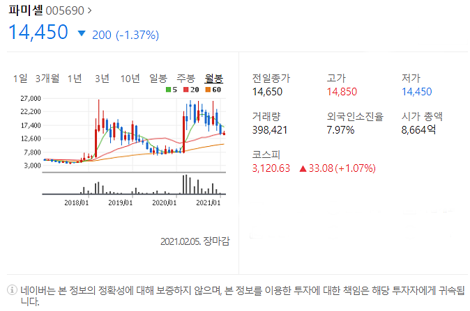 다섯번째는 파미셀입니다. [005690]