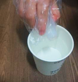 종이컵에 표시를 했다면, 종이컵에 표시한 만큼 소독용 에탄올을 넣어주고 일회용 수저와 손 모두를 소독해줍니다.