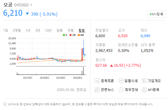 마스크 관련주로 이슈가 되긴 했지만, 게시판에서는 마스크와는 관련없는 본드회사다 마스크는 생산하지 않는다 등의 글들이 올라와있답니다. 실제로 검색을 해 봤을 때 오공이름을 단 마스크는 보이지 않았어요.