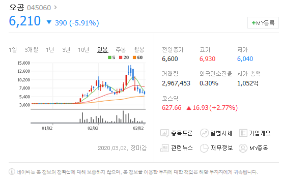 마스크 관련주로 이슈가 되긴 했지만, 게시판에서는 마스크와는 관련없는 본드회사다 마스크는 생산하지 않는다 등의 글들이 올라와있답니다. 실제로 검색을 해 봤을 때 오공이름을 단 마스크는 보이지 않았어요.