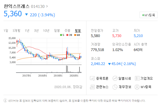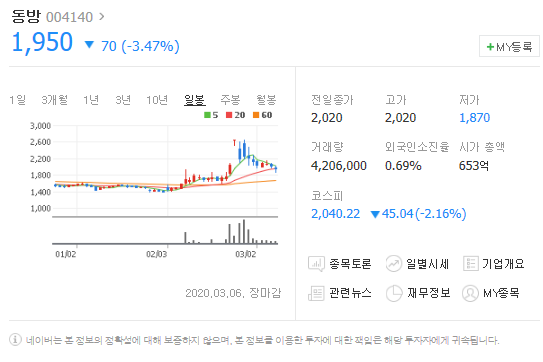 예전에는 한화그룹이 아사아나항공을 인수할 것이라는 말이 있어서 주가가 급등하기도 했었는데, 이번 코로나 사태로 동방에 비해서는 낮아보이나 물류관련의 기대감 때문인지 영향을 받는 것 같아요.