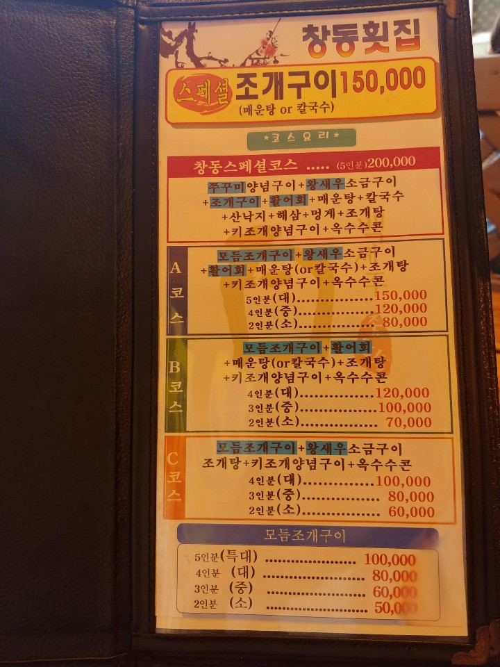 C코스 = 모듬조개구이, 새우 소금구이, 조개탕, 키조개 양념구이, 옥수수콘