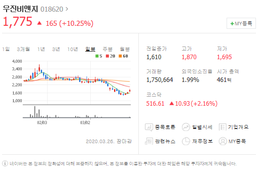 네번째는 우진비앤지입니다. [ 018620 ]