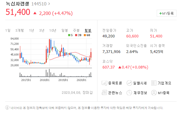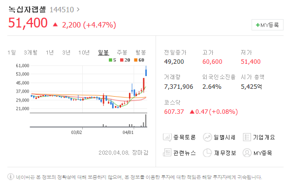 전일대비 2200원 상승했으며, 4월 8일 51400원으로 마무리되었네요.