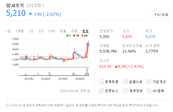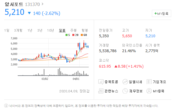 전일대비 140원 하락했으며, 4월 9일 5210원으로 마무리 되었네요.