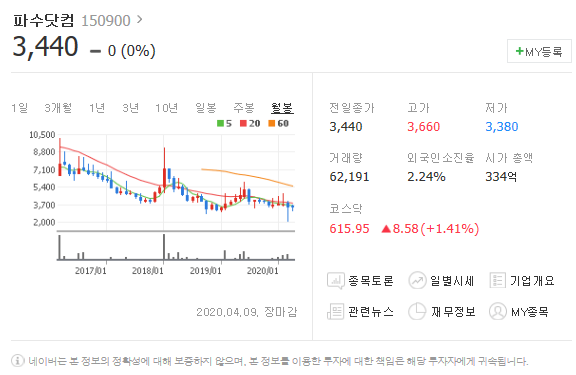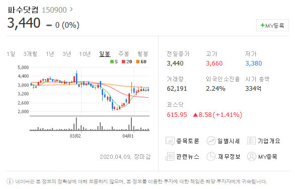 전일대비 변동은 없습니다. 4월 9일 3440원으로 마무리 되었네요.