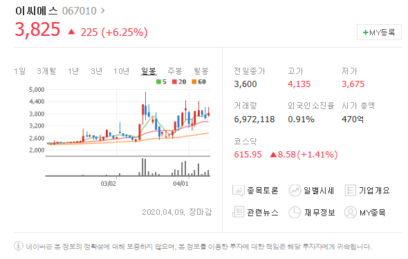 전일대비 225원 상승했으며, 4월 9일 3825원으로 마무리 되었네요.
