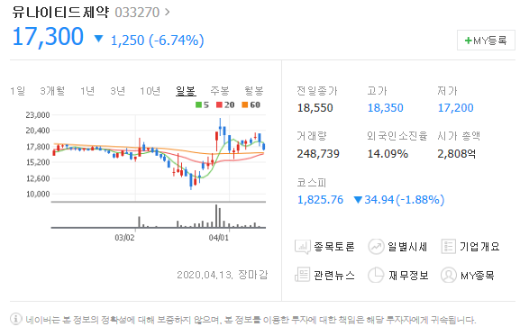 클로로퀸관련주 유나이티드제약 일봉 월봉