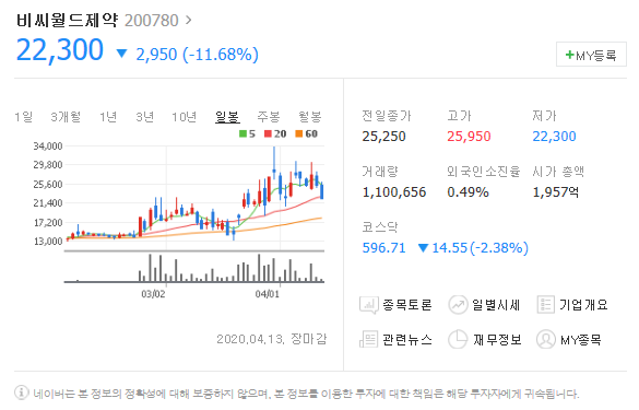 클로로퀸관련주 비씨월드제약 일봉 월봉