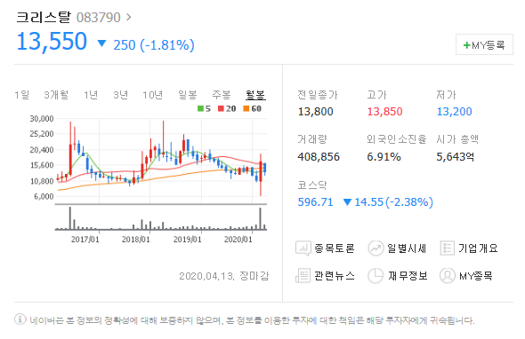 크리스탈은 코로나 치료에 사용되는 약물인 클로로퀸의 수출을 추진한다는 소식으로 관심을 받고 있답니다.