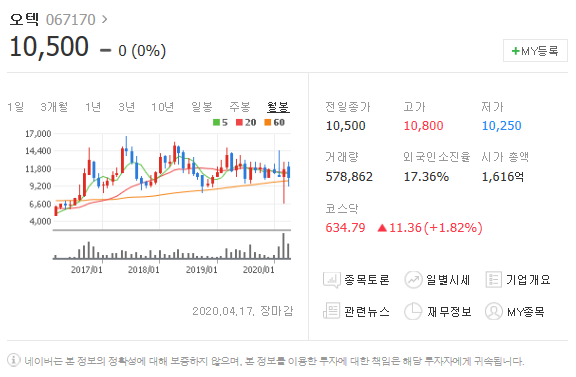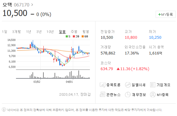 전일대비 가격변동 없으며, 4월 17일 10500원으로 마무리 되었네요.