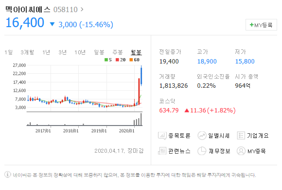 전일대비 3000원 하락했으며, 4월 17일 16400원으로 마무리 되었네요.