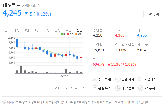 저점을 한번 찍고 완만하게 상승하는 차트가 인상깊어요. 네오펙트 자체의 전망도 좋고 흐름 또한 좋다고 생각하지만, 거래량에서 아쉽긴 하네요.