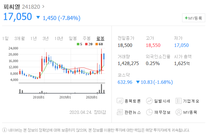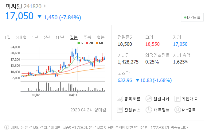 지난 금요일 1450원 하락했으며, 4월 24일 17050원으로 마무리 되었네요.