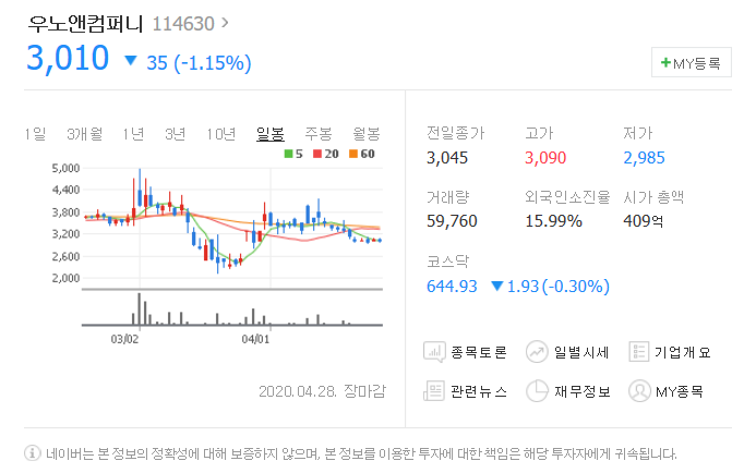 전일대비 35원 하락했으며, 4월 28일 3010원으로 마무리 되었네요.