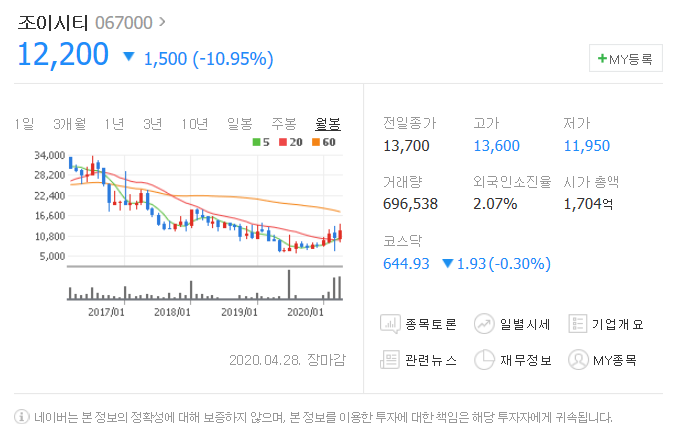 전일대비 1500원 하락했으며, 4월 28일 12200원으로 마무리 되었네요.