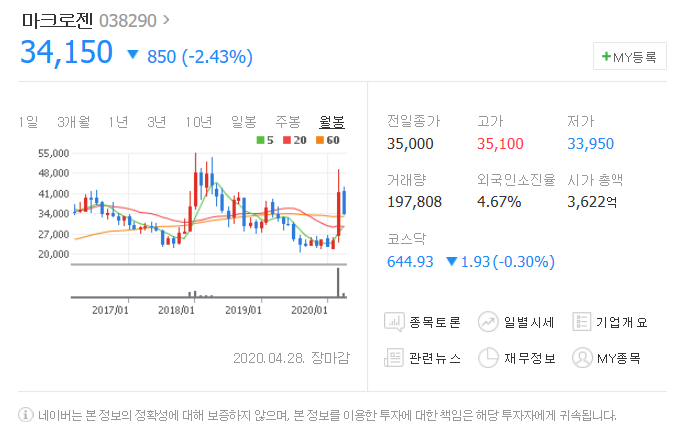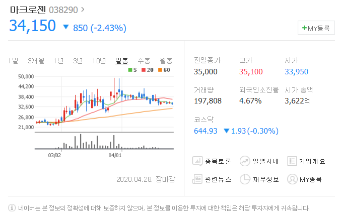 전일대비 850원 하락했으며, 4월 28일 34150원으로 마무리 되었네요.