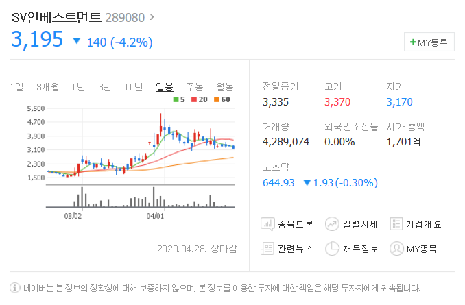 네번째는 SV인베스트먼트입니다. [ 289080 ]