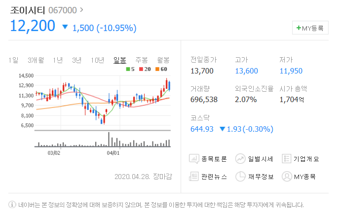 전일대비 1500원 하락했으며, 4월 28일 12200원으로 마무리 되었네요.