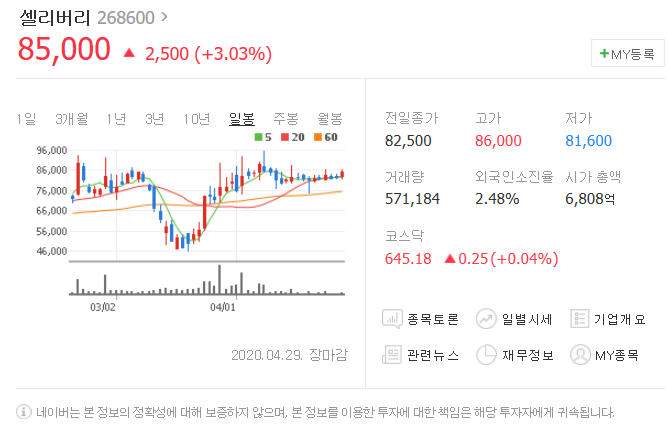 전일대비 2500원 상승했으며, 4월 29일 85000원으로 마무리 되었네요.