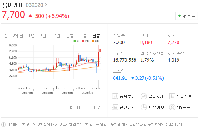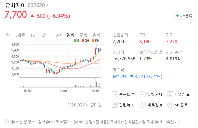 5월 4일 500원 상승했으며, 5월 4일 7700원으로 마무리 되었네요.
