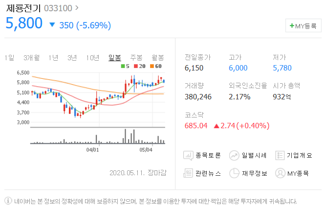 5월 11일 350원 하락했으며, 5월 11일 5800원으로 마무리 되었네요.