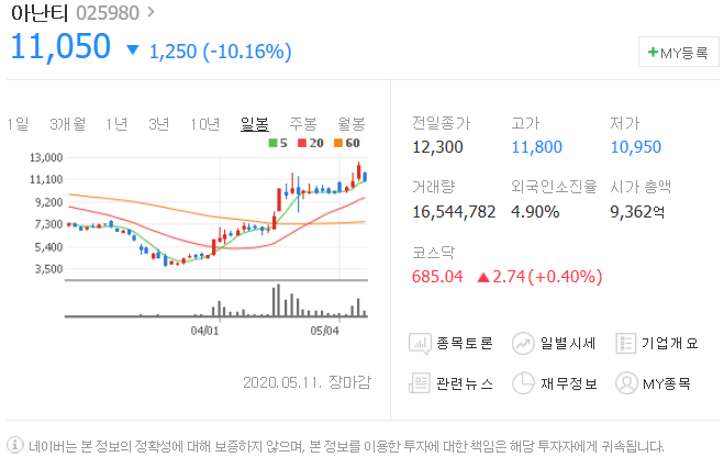 5월 11일 1250원 하락했으며, 5월 11일 11050원으로 마무리 되었네요.