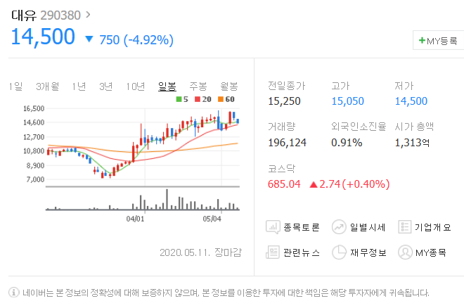 5월 11일 750원 하락했으며, 5월 11일 14500원으로 마무리 되었네요.