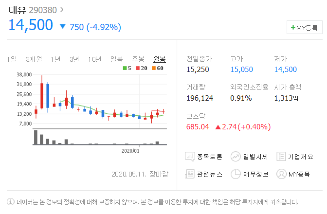5월 11일 750원 하락했으며, 5월 11일 14500원으로 마무리 되었네요.