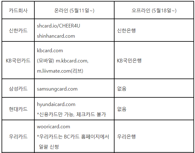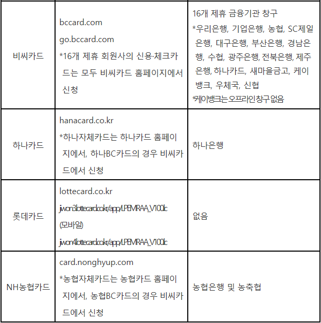 신청할 수 있는 카드사는 KB국민카드, NH농협카드, 롯데카드, 비씨카드 삼성카드, 신한카드, 우리카드, 하나카드, 현대카드에요.