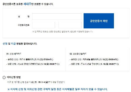 긴급 재난지원금 신용,체크카드 신청 홈페이지