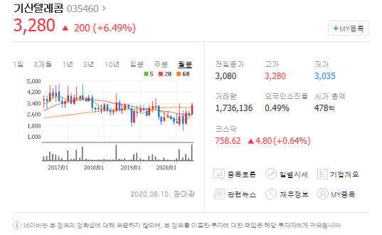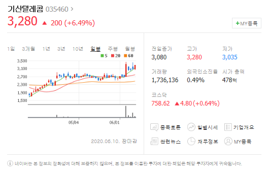 네번쩨는 기산텔레콤입니다. [ 035460 ]