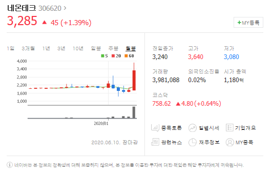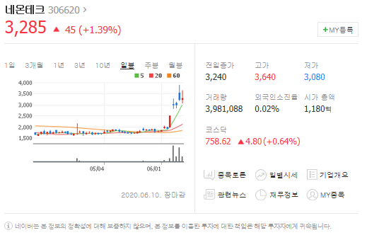전일대비 200원 상승했으며 6월 10일 3280원으로 마무리 되었네요.