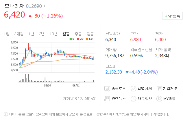 전일대비 80원 상승했으며, 6월 12일 6420원으로 마무리 되었네요.