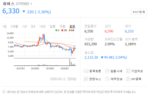 비말차단 마스크관련주 휴비스 일봉 월봉