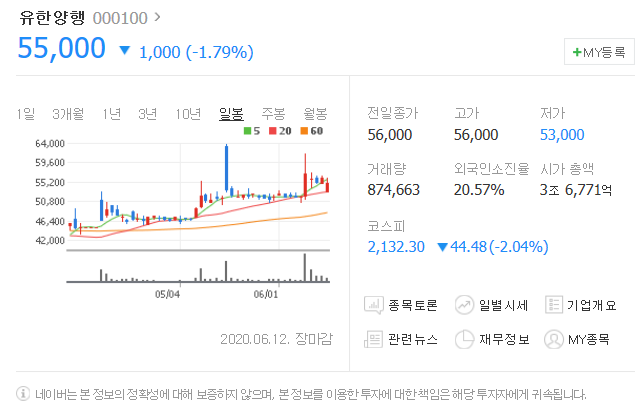 전일대비 1000원 하락했으며 6월 12일 55000원으로 마무리 되었네요.