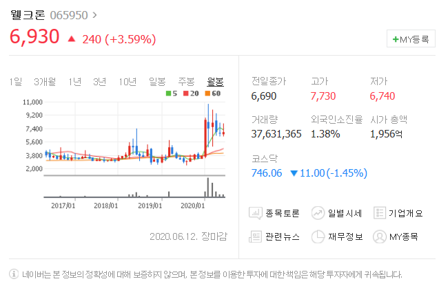 전일대비 240원 상승했으며, 6월 12일 6930원으로 마무리 되었네요.