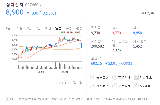 6월 12일보다 830원 하락했으며, 6월 15일 8900원으로 마무리 되었네요.